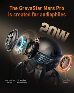 • 【CRAFTED DESIGN, CRAFTED SOUND】The GravaStar Mars Pro is created for music lover. The Bluetooth speaker has built-in, exclusive DSP audio algorithms that give you a deep bass, accurate mids, and crisp highs. Combined with an equal-loudness contour, you get a powerful sound experience.