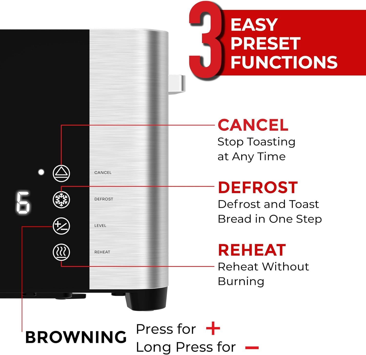 Use the touch buttons with LED display to effortlessly adjust browning levels. The self-centering guides will center the bread, allowing for even heating and the perfect browning of each side.