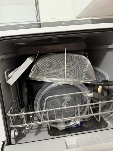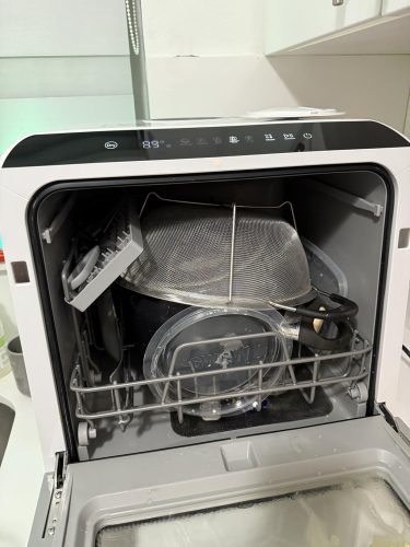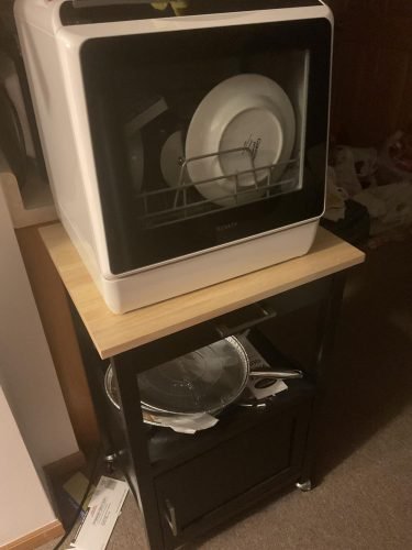 I'm a mom to a toddler and I'm also pregnant so I'm very busy! I've never liked doing dishes and my husband was always upset when we had dirty dishes in the sink. He did not want to spend the $ to purchase a dishwasher so I waited almost a year till I bought this for myself on my birthday. I'm glad I waited and found this one specifically. Our cabinets are 2 inches too long to fit even the smallest of these underneath! And all the other countertop dishwashers I viewed previously had to be connected to a water source. When I began searching again and found this one that doesn't need to be connected and can just be filled up I purchased it immediately! I did read reviews about issues some people had so all I have to say is GET THE ADDITIONAL WARRANTY. I had to get a creative when figuring out where this would go. To fit this I bought a huge very heavy and strong wooden cutting board from Walmart and put it over the smaller area of our kitchen sink (it's split into 2 sections). The dishwasher went on top of this and the water drain tube went behind the machine and cutting board directly into the sink. My husband was really irritated that I went and spent money on this but it was a bday gift to myself! No regrets! Anyway, when setting it up I decided I was gona really pack this thing and see how well it actually does. Wow!!! You can fit so much more than I expected and everything gets clean! After a few days of this my husband finally got around to trying it and he absolutely changed his mind. We have almost no dishes sitting in the sink anymore! It cleared up a ton of clutter as well because you do not need to use a drying rack anymore. I get very creative when putting the dishes in, it's like a puzzle to fit as many things as possible. Oh, side note, since I pack it so much I only use the heavy duty cycle because it uses the same amount of water as the normal cycle anyway and it's only 20 minutes longer. After the first few days I noticed that there was some debris left behind in the machine so I ran a cycle with a bit of distilled white vinegar and it cleaned it right up! The detergent tablet leaves residue on the dishes so I started using about 1/2 a cup of the white vinegar with every load and the dishes are completely spotless and squeaky clean! I do not go easy on this machine, the only thing I do is remove any small chunks of food on the dishes. Other than that I put them in fully dirty; some with dried on sauces, some very oily, some with cake batter, etc. I want to make sure this machine can clean fully! And it does! (I'm sure the vinegar helps alot TBH). Another side note, The silverware container takes up too much space. So I removed it and we place the utensils inside the slots of the shelf that the mugs are supposed to sit on top of in the photos. You can still fit mugs and short cups underneath the shelf. We also place any tops/covers, cooking tools, or miscellaneous items on the shelf with the utensils, sometimes stacking them. FYI, they all get clean.